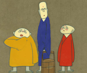Inspired by the works of the Dutch abstractionist Piet Mondrian, Xu emphasizes an extreme sense of simplicity through the adjustment of the framing ratio and the rendering of the color palette (Sun 62). Three Monks applied a 1:1 instead of a 4:3 ratio to make everything visually square (王 80). The three monks, who are the only lively human figures featured in the animated short, dress in primary colours, that is, red, blue, and yellow, so as to easily distinguish them from one another (Ibid.).